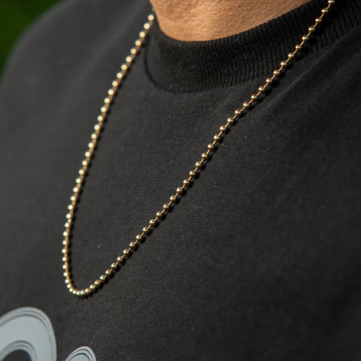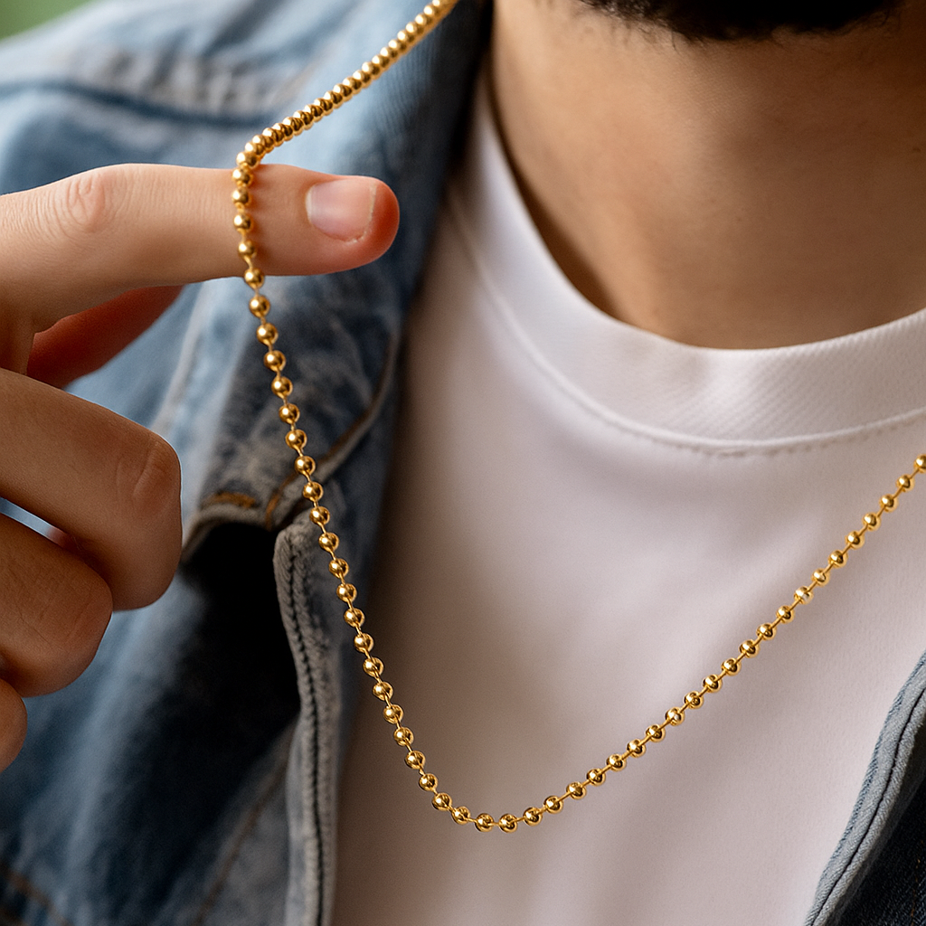 Eslabones de balines redondeados y uniformes que crean una superficie compacta, equilibrada y elegante, evocando el carácter atemporal del estilo masculino.